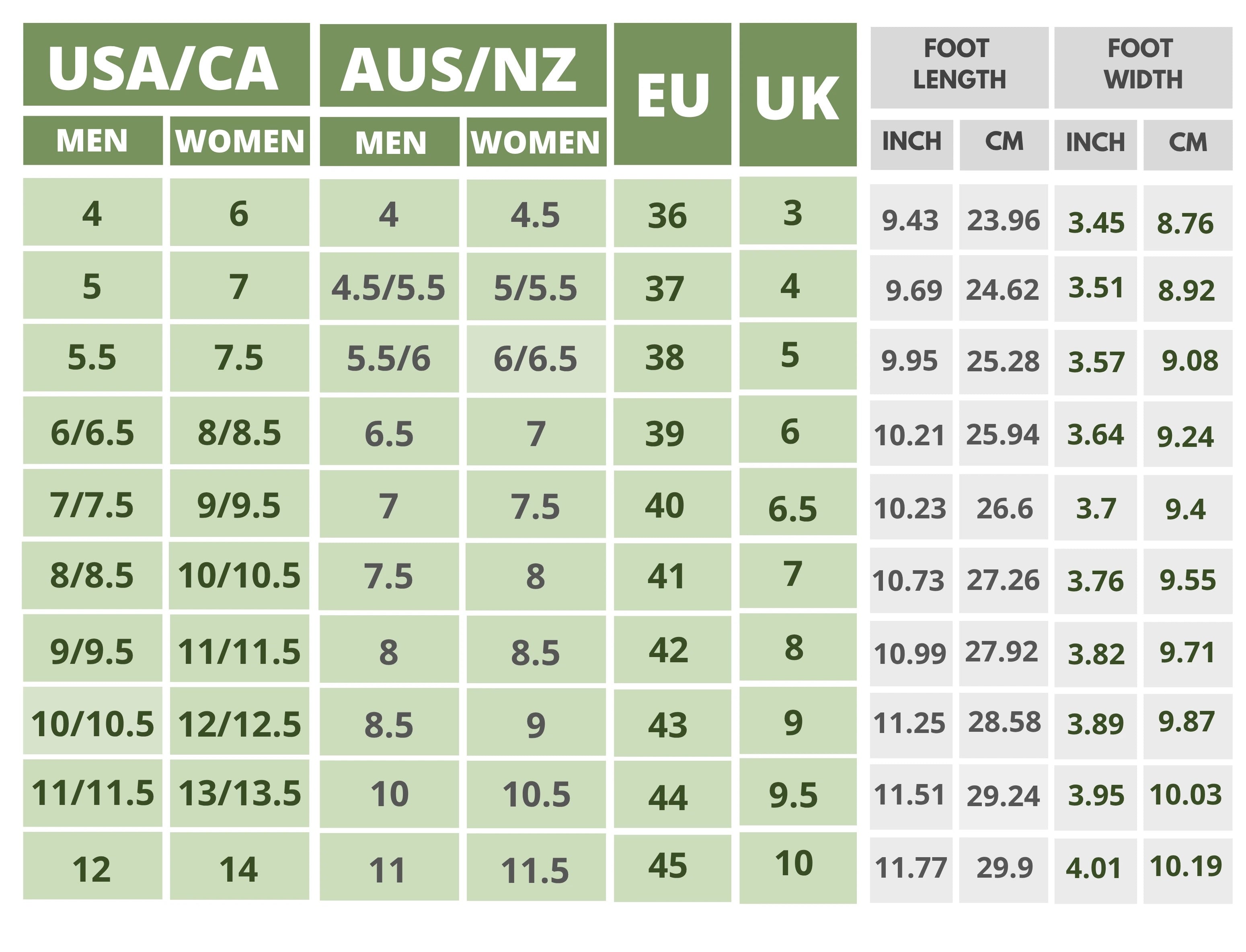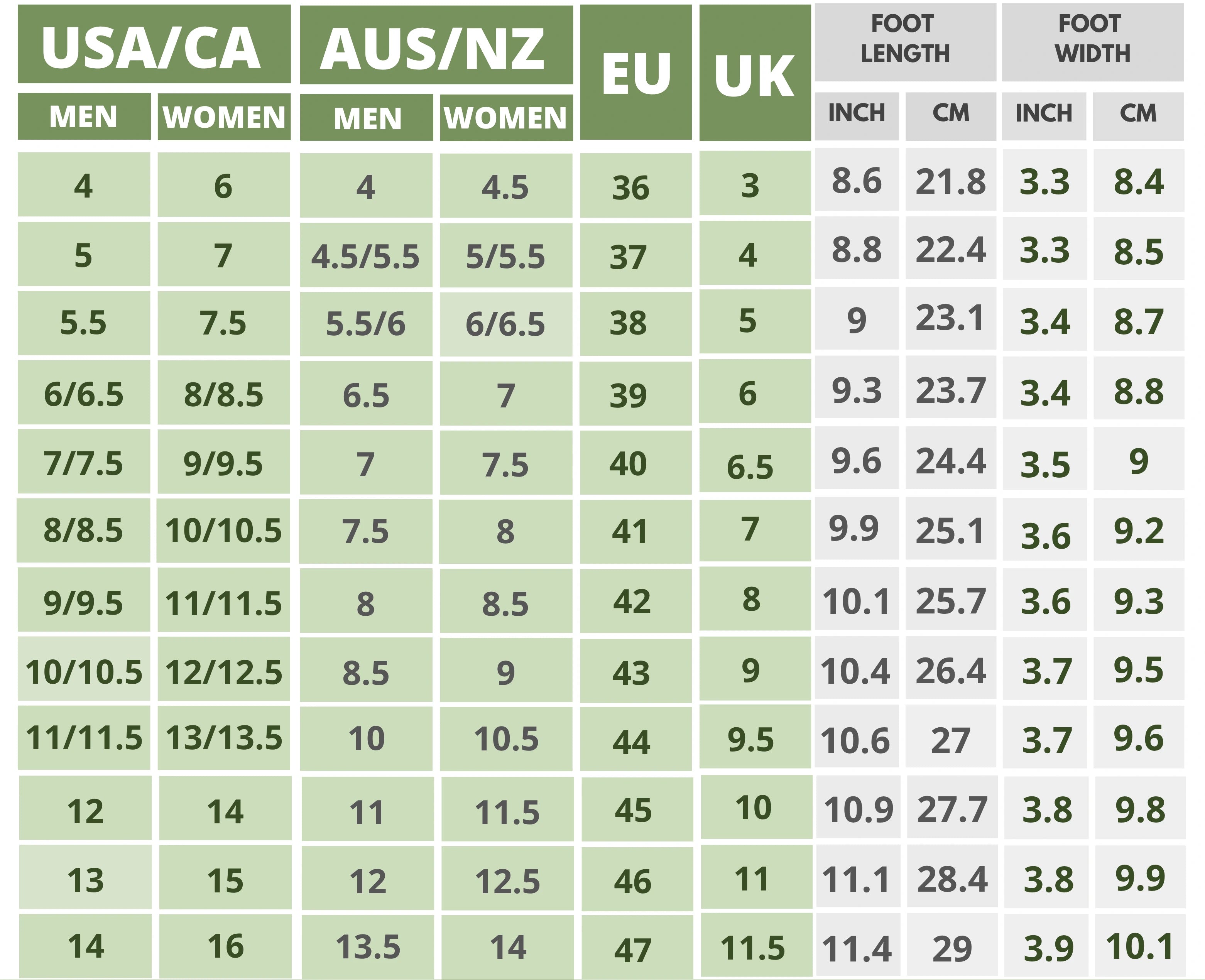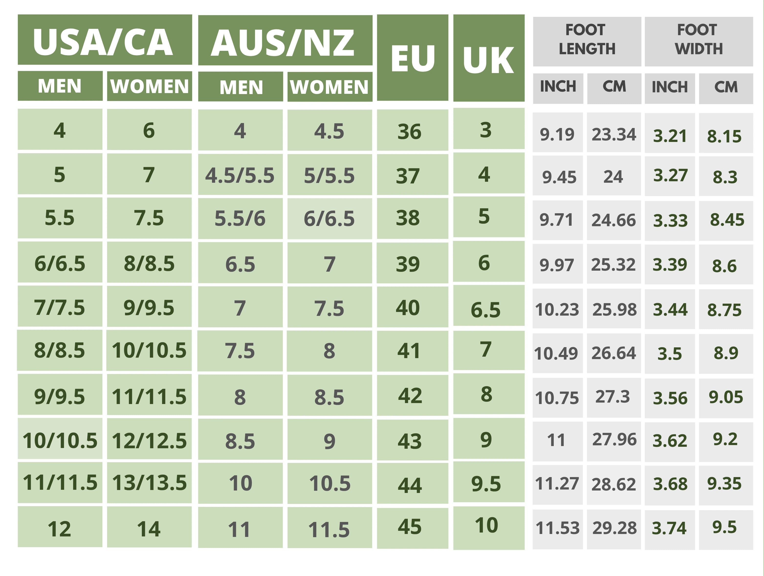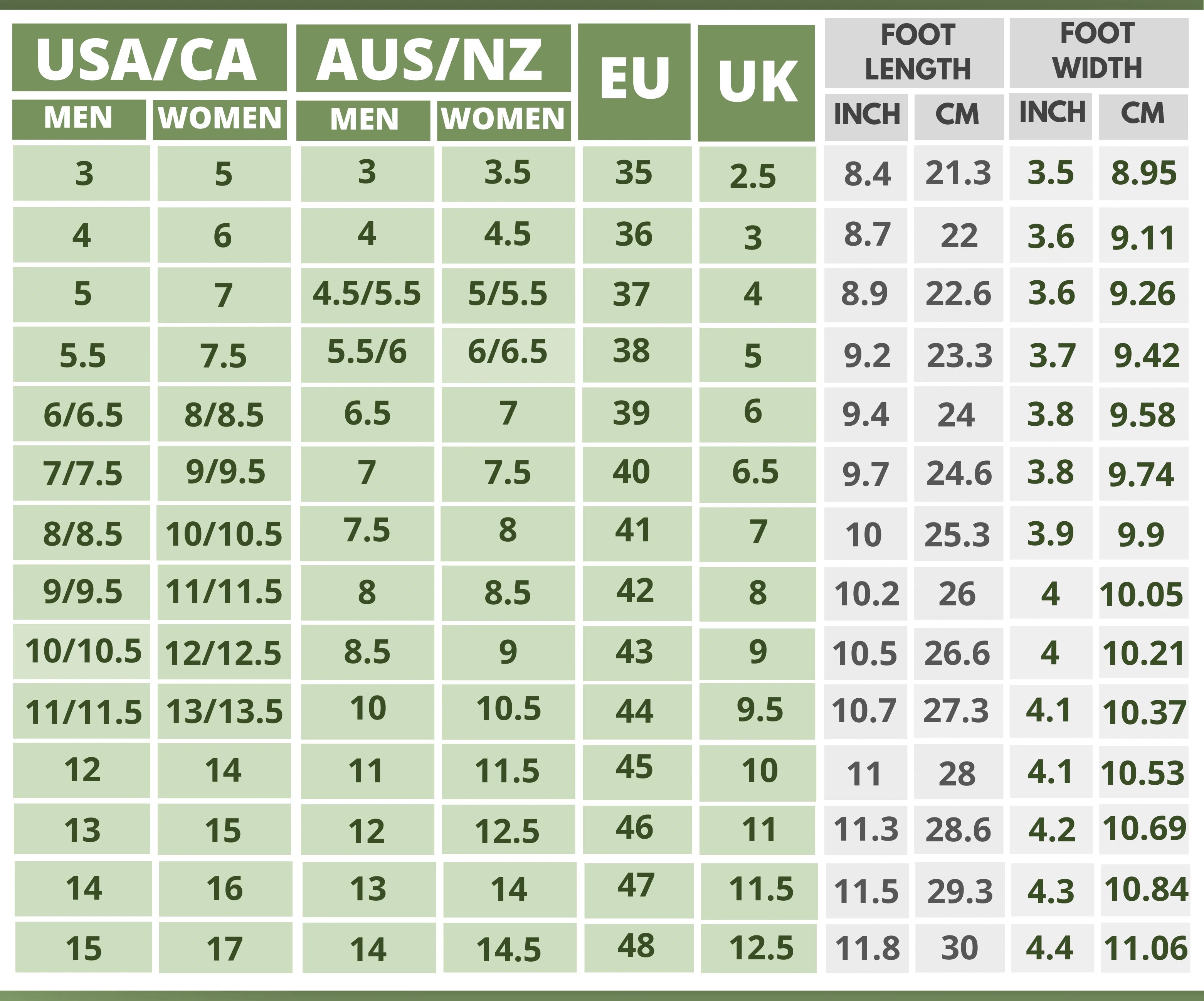 Click On the Shoe Name to Find The Size Chart