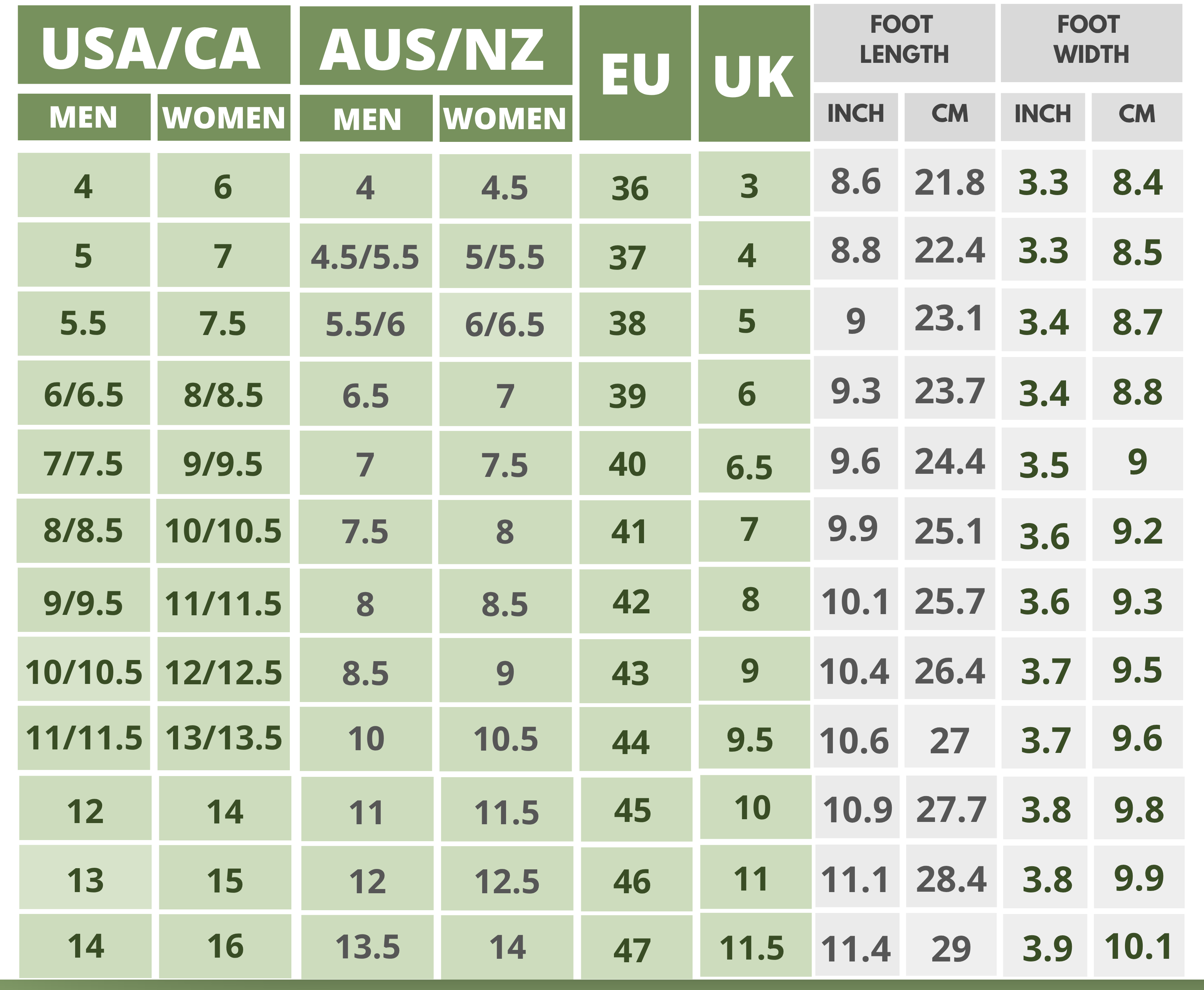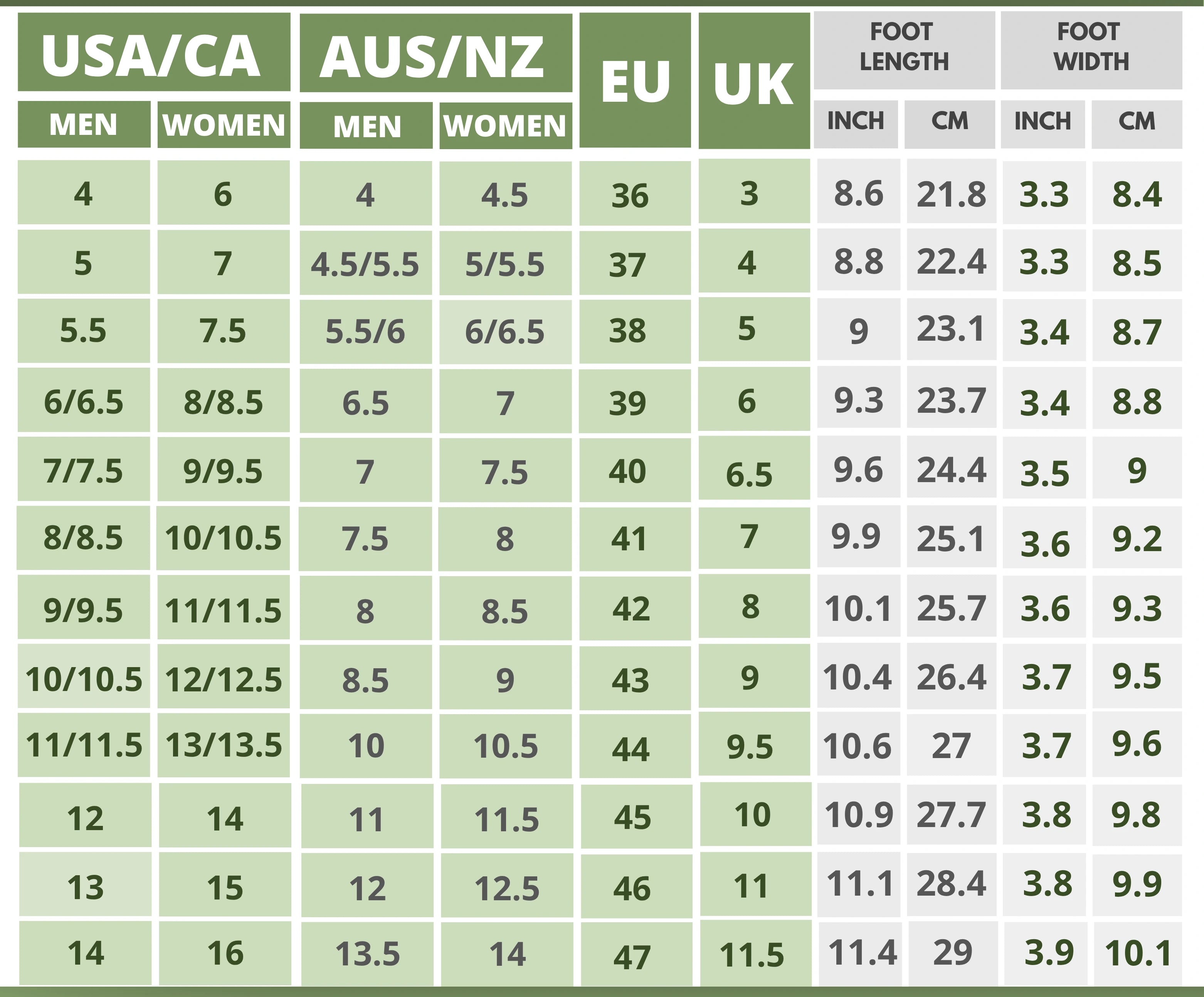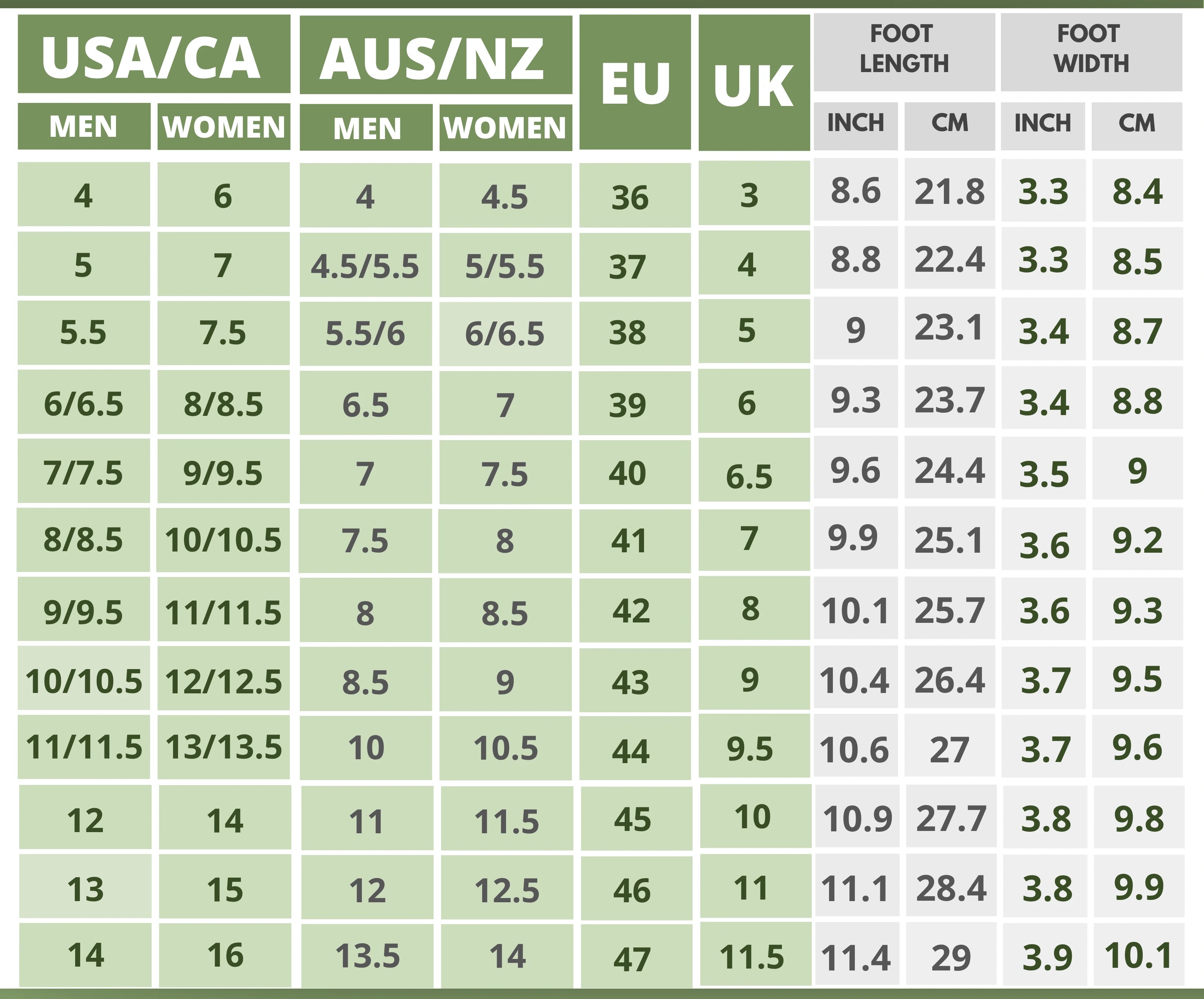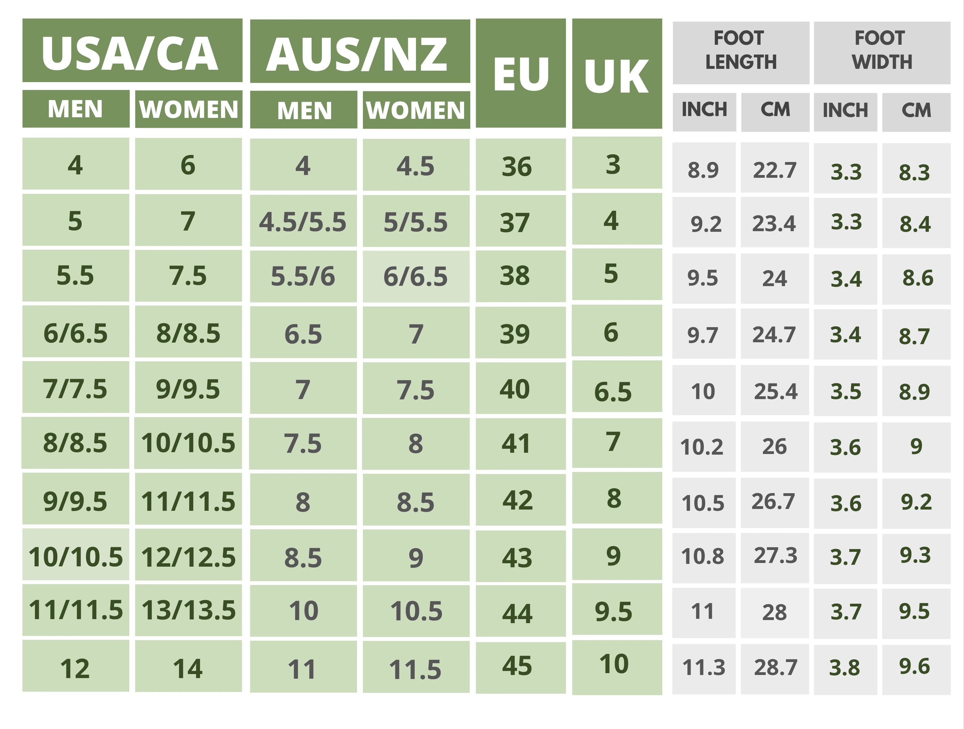 Click On the Shoe Name to Find The Size Chart